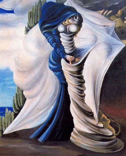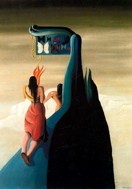 One of the earliest of his surrealist works is Portrait of Roma. It was painted a year before he met Breton. The painting shows his lover at that time, Roma Damska, a Polish pianist. Here she is shown in the pose almost of a classical statute, such as the Venus de Milo. Her disembodied hands continue to play the piano. The page of music on the piano appears to be a Dragon Tree, and we see this linked through the window to an actual dragon tree which is native to the Canary islands.