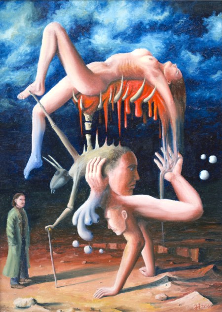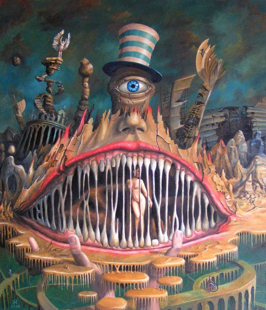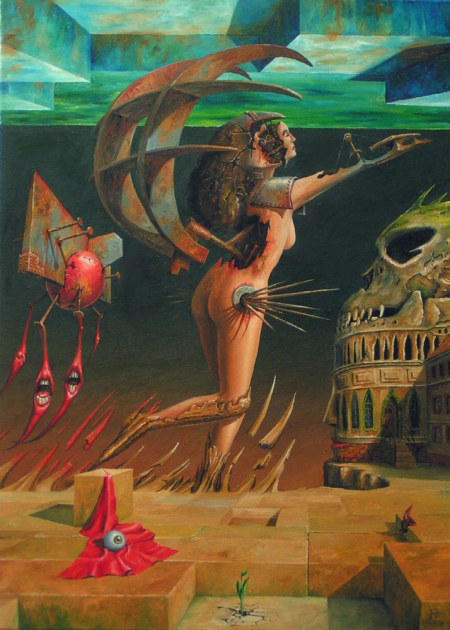 Jasnikowski's work was quickly recognised, so much so, that he became one of the leading exponents of fantastic realism in Poland, and his paintings are in collections all over the world. He paints a number of themes, often involving strange, impossible flying machines, and he likes to morph the human body into architectural structures. He also often depicts human flesh flowing like soft wax.