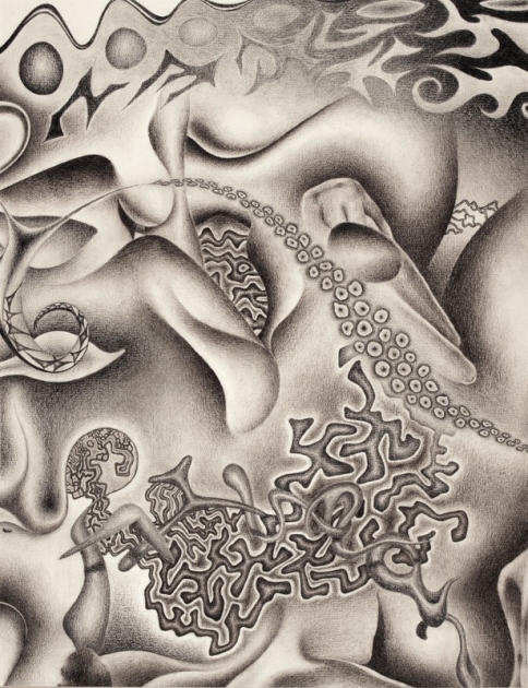 He was drawn to the images in a copy of Grey's Anatomy especially magnifications of cells or cross-sections of bone. He also found the 19th century illustrations by Ernst Haeckel of radiolarians and other strange and beautiful life-forms. His abstract surrealist paintings are thus inspired by biological forms.