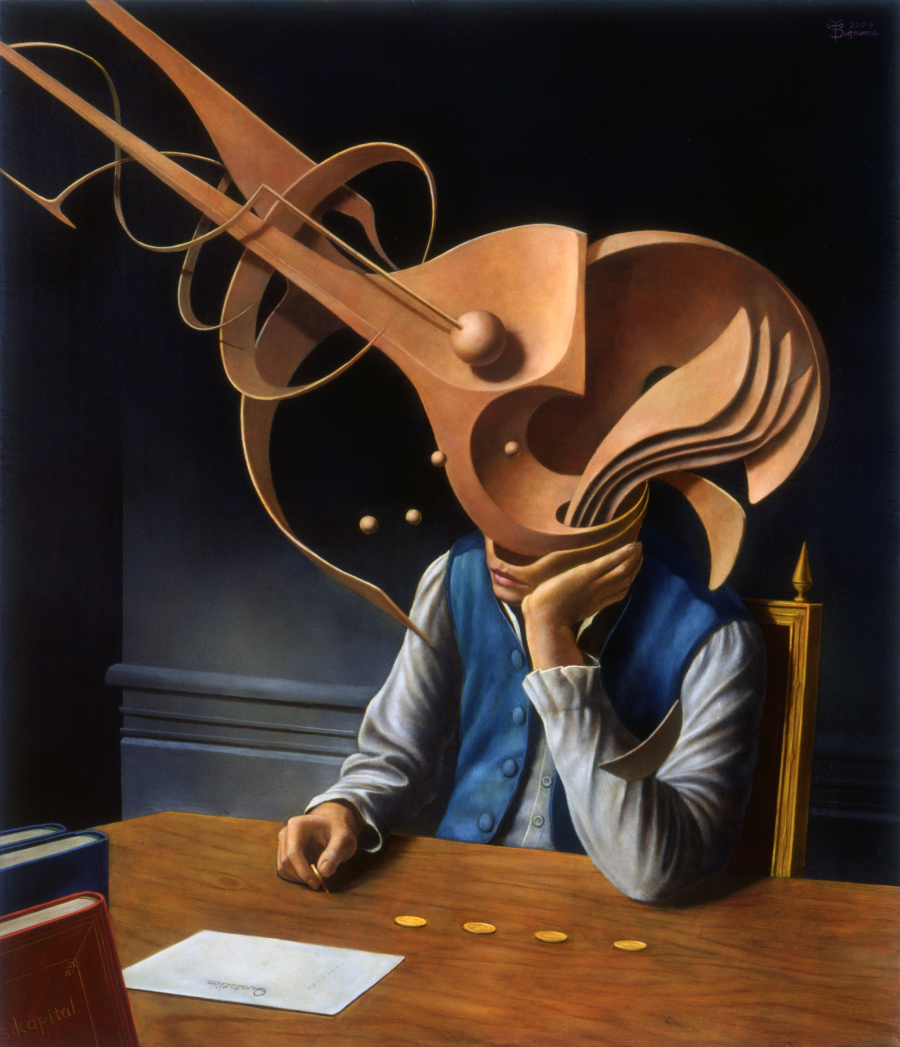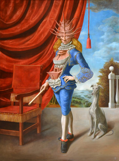 His paintings are mainly about the transformation of persons. He brings this together in a surrealistic, characteristic way and with graceful forms, playing with the fusion of form and meaning.